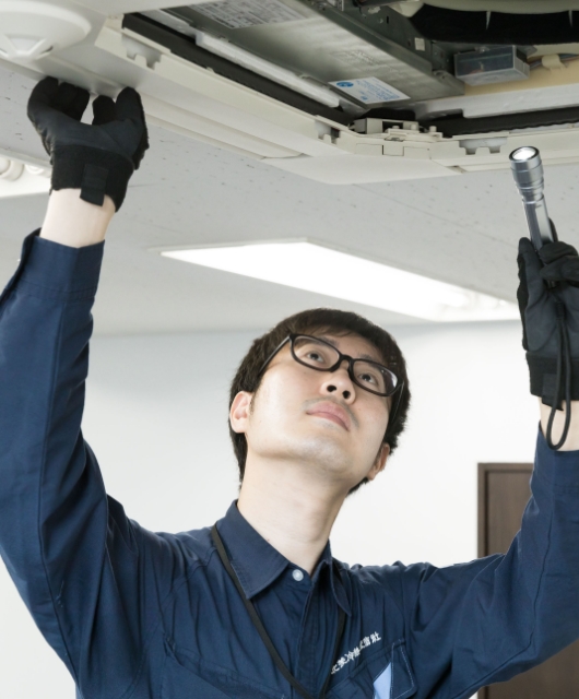 今年度から班長として、助手である後輩と2人1組で現場を回っています。主に受け持っているのは、空調設備の定期点検。動作に問題がないかチェックし、フィルター清掃を行います。